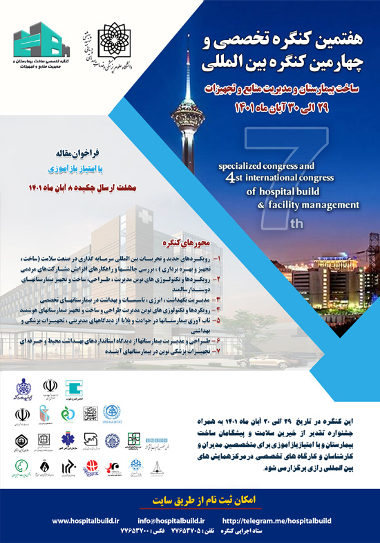 هفتمین کنگره تخصصی و چهارمین کنگره بینالمللی ساخت بیمارستان و مدیریت منابع و تجهیزات در محورهایی نظیر رویکرد جدید و تجربیات بینالمللی سرمایهگذاری در صنعت سلامت، رویکردها و تکنولوژیهای نوین مدیریت، طراحی، ساخت و تجهیز بیمارستانهای دوستدار سالمند، مدیریت نگهداشت، انرژی، تاسیسات و بهداشت در بیمارستانهای تخصصی و تجهیزات پزشکی نوین در بیمارستانهای آینده برگزار خواهد شد.